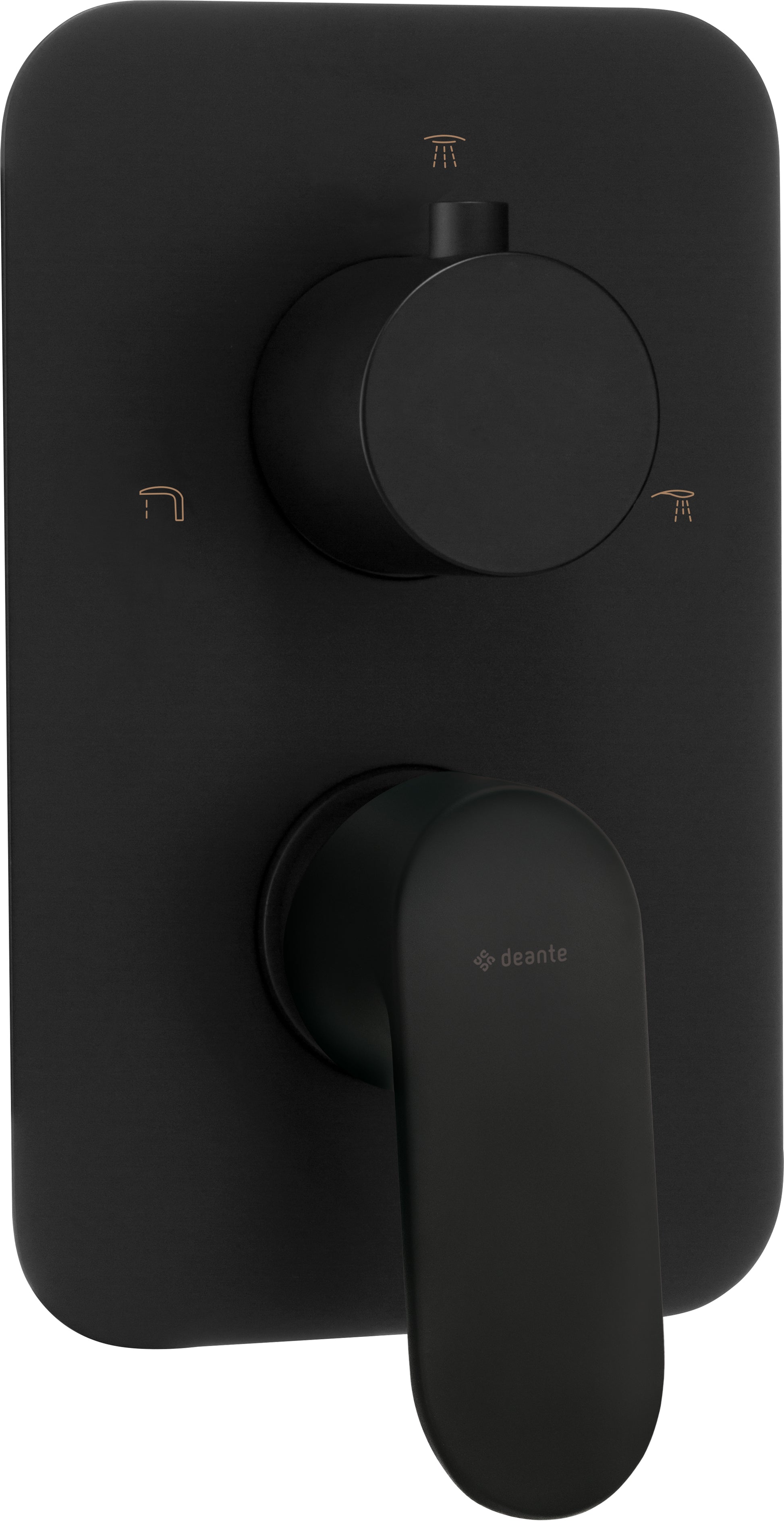 DEANTE ALPINIA Unterputz Duscharmatur für Mischbox, Schwarz: Dieses äußere Element der Unterputz-Mischbox aus der Serie ALPINIA präsentiert sich in edlem Mattschwarz. Die abgerundeten Konturen der Rosette sowie die weichen, symmetrischen Formen des Hebels betonen die elegante, ruhige Handschrift von ALPINIA. Die Unterputzmontage reduziert sichtbare Technik auf ein Minimum und unterstreicht ein klares, modernes Baddesign. Die Mischbox ist separat erhältlich.