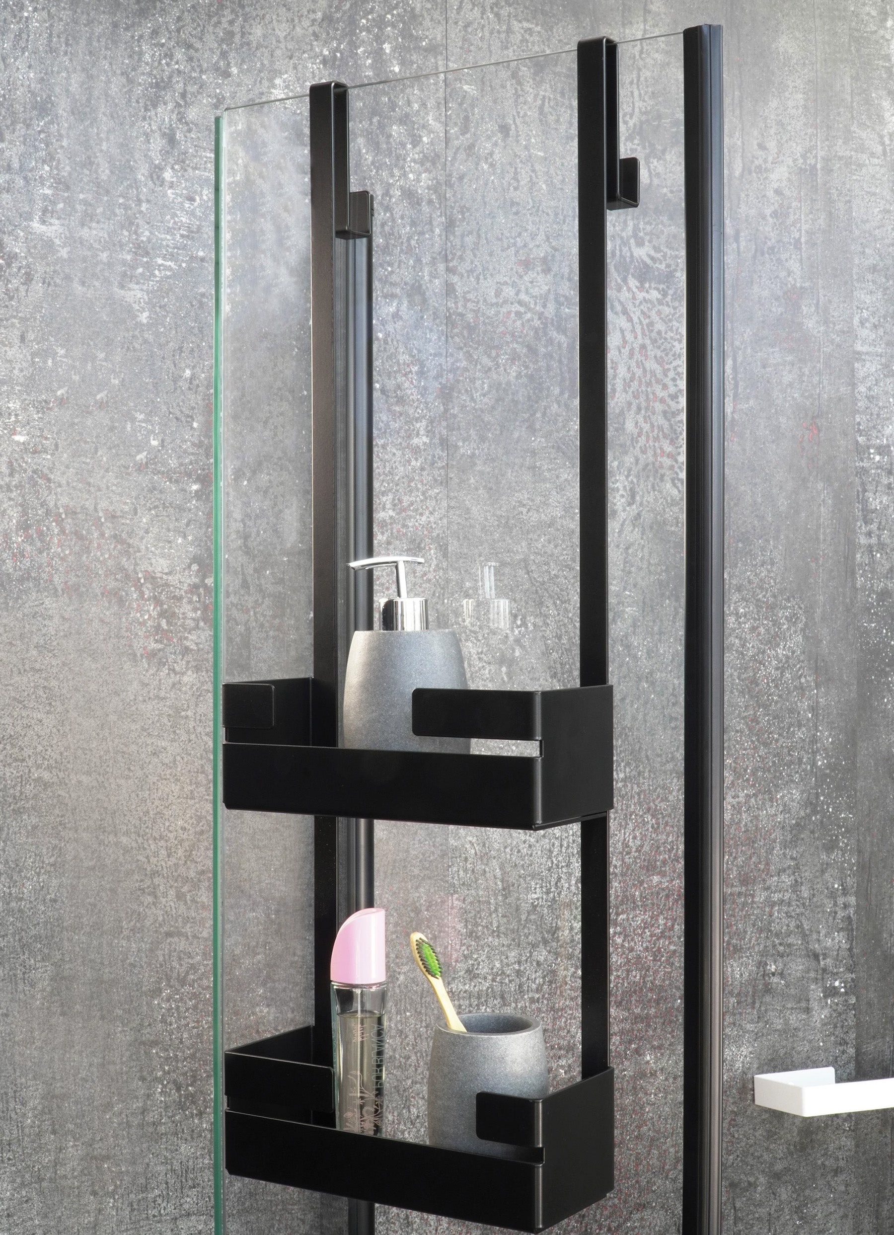Gefertigt aus 2,5 mm starkem Stahl, wird das Regal einfach an der festen Glasscheibe der Duschkabine oder einer begehbaren Dusche eingehängt – mit Ablagen auf der Innenseite und Handtuchhaken außen. Neben der unkomplizierten Montage überzeugt dieses Accessoire durch sein reduziertes Design, seine ergonomische Form, die hochwertige Verarbeitung sowie den tiefschwarzen Farbton in edlem Satinfinish.